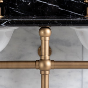 The quality of materials and craftsmanship found within the handmade Bloomsbury washstand is synonymous with Rutland London. Handmade to order in our family-owned Hampshire factory, the luxury Bloomsbury Vanity Suite is manufactured from 32mm diameter DZR brass tube, timeless Italian ball joints and elegant 75mm diameter brass wall plates.