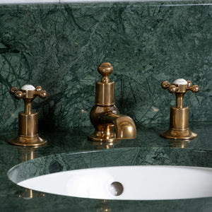 Complimenting its timeless brass frame, the Trinity Vanity Suite is supplied with a stunning marble top, matching upstand and elegant porcelain basin to add to the products enduring allure and appeal.