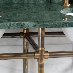 The quality of materials and craftsmanship found within the handmade Trinity washstand is synonymous with Rutland London. Handmade to order in our family-owned Hampshire factory, the luxury Trinity Vanity Suite is manufactured from 32mm diameter DZR brass tube, modern "standard" joints and elegant 75mm diameter brass wall plates.